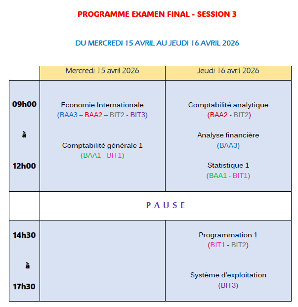 Disponible, mais pas affiché sur la page de coursNon publié aux étudiantsEMPLOI DU TEMPS 2025-2026 BIT 3 (Session 3)